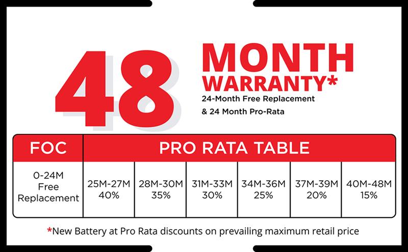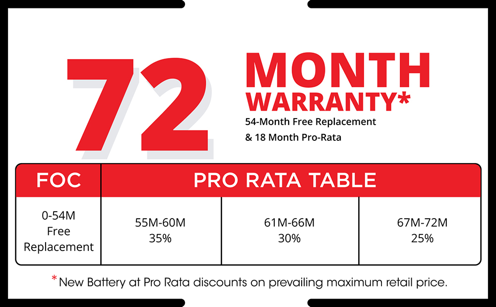 For terms and conditions of pro-rata warranty, you can also check the warranty table given on the battery or on the website. Please refer to the application chart available at the respective purchase counters for recommended fitment.