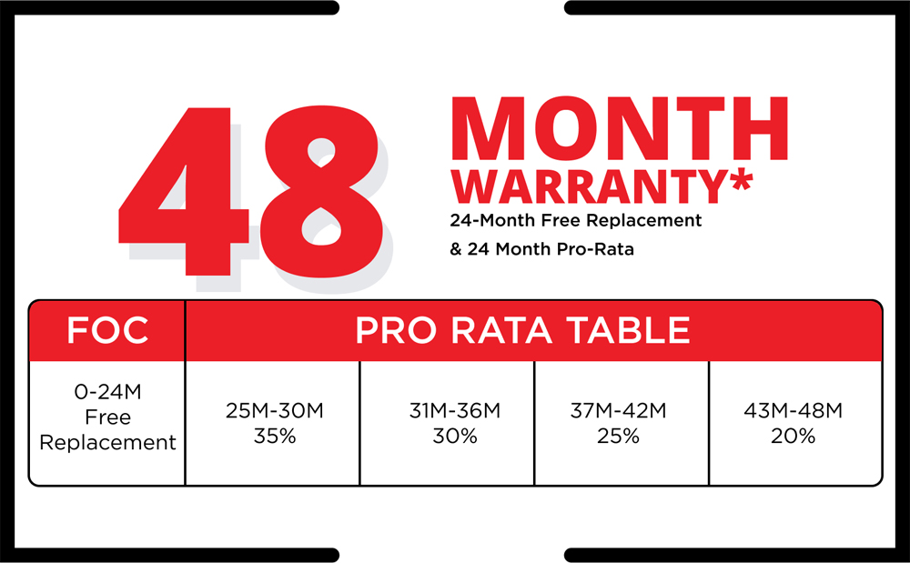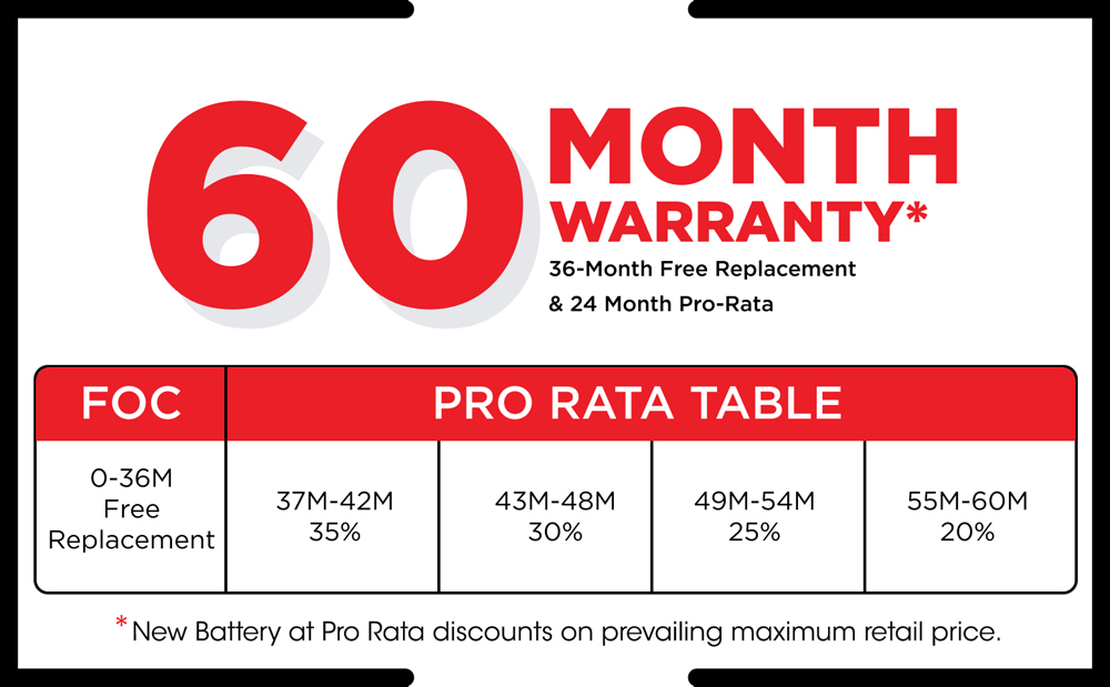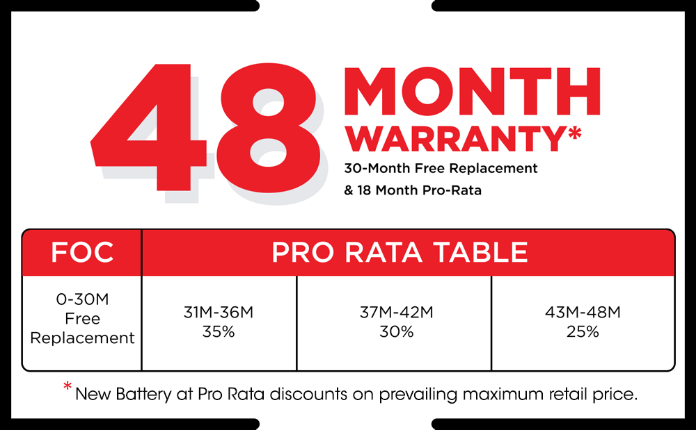 For terms and conditions of pro-rata warranty, you can also check the warranty table given on the battery or on the website.
